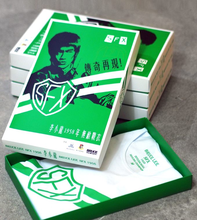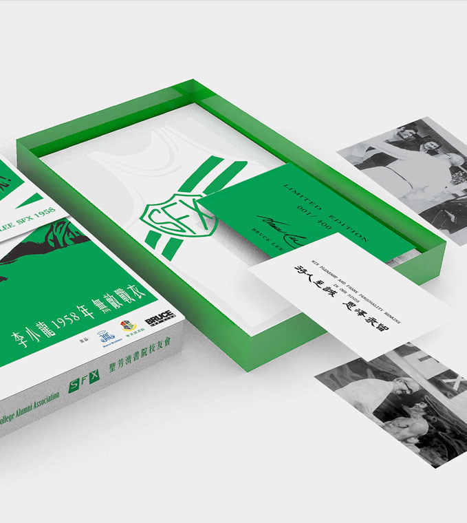 This project aims at offering a new packaging for the classic singlet to be sold at Bruce Lee Memorial Night. Bruce Lee was a martial artist, actor whose career spanned Hong Kong and the US. The singlet is designed in 1950s where Bruce wore it to fight and won in the boxing competition. The boxset came with a unique certificate and a set of two photos captured in 1954 at St. Francis Xavier's College where Bruce studied for a few years.